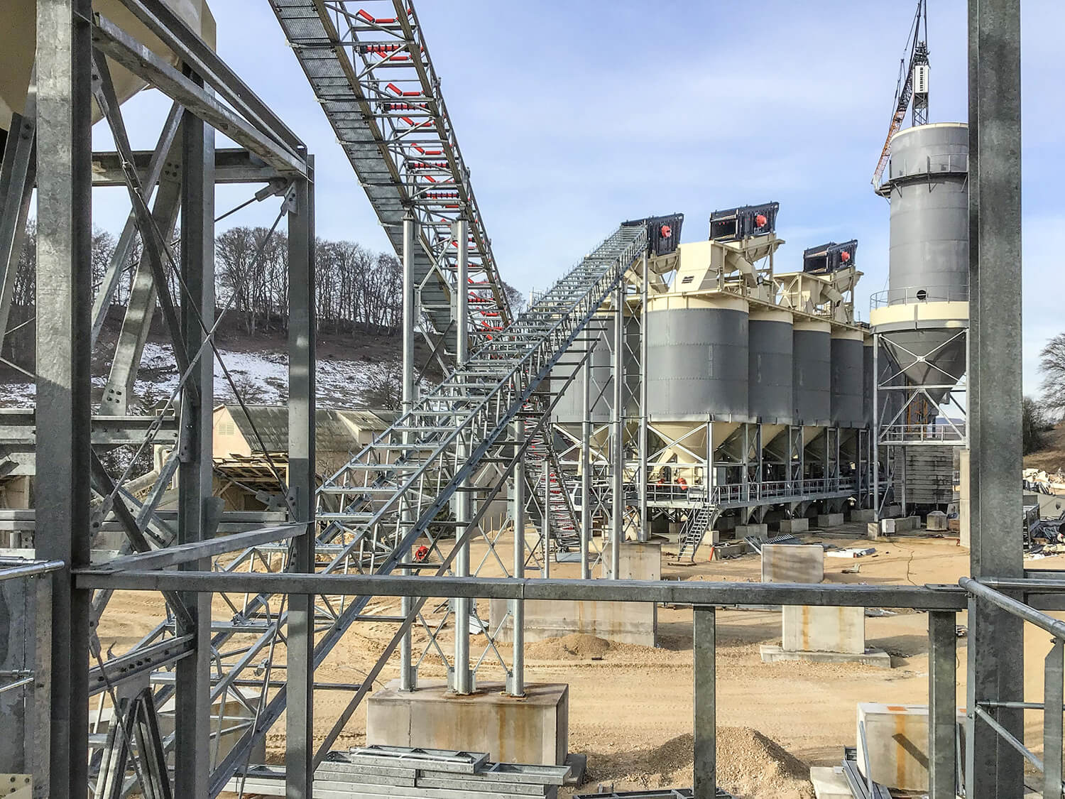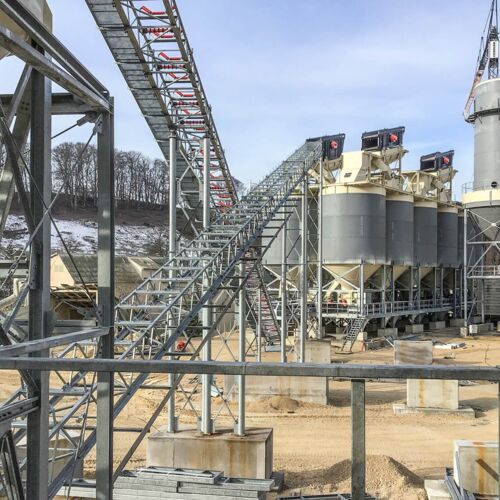 Dabei haben wir stets die gesamte Anlage im Blick und können, den Anforderungen entsprechend, diverse Komponenten aus eigener Fertigung wie beispielsweise Silos, Förderanlagen, Abzugs- und Dosierorgane oder Verladeanlagen einplanen. Durch eine intensive Zusammenarbeit mit allen führenden Maschinenbauern in der Stein- und Erdenindustrie integrieren wir auch Bestandteile wie Brecher und Siebmaschinen. Somit können wir komplette Steinbruchanlagen vom Vorbrecher bis zur Verladung aus einer Hand realisieren.