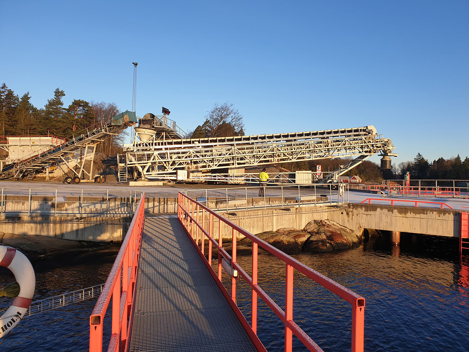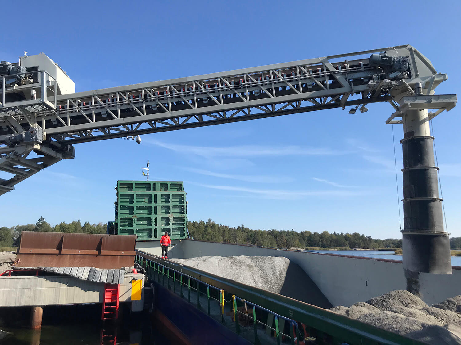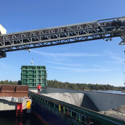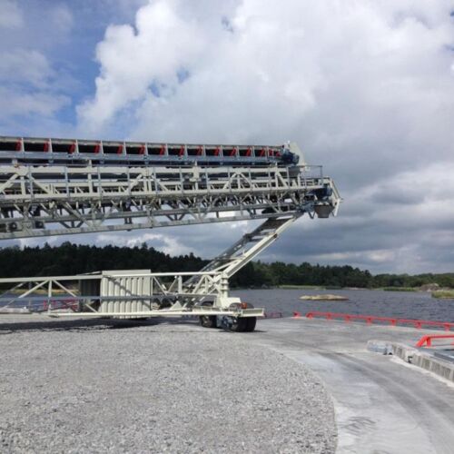 Für die sichere und zuverlässige Schiffsverladung verwenden wir unsere bewährten Radialteleskop-Förderer. Durch die Höhenverstellung mittels hydraulischer Hubeinrichtung passt sich der Förderer an die Schiffsgrößen und Gezeiten optimal an. Gleichzeitig ermöglicht es die elektromotorische Radial- und Teleskopiertechnik die Schiffe ohne Verholen von einem Speisepunkt aus konstant zu Beschicken.